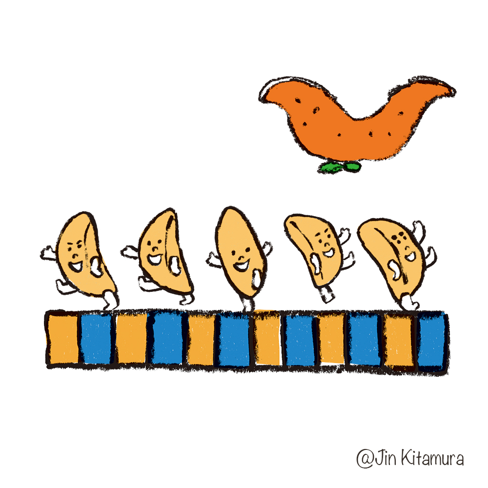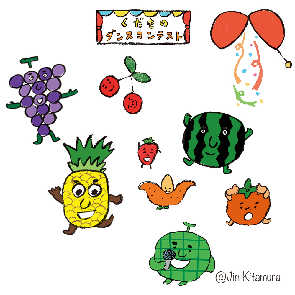 くだものたちがダンスコンテストに大集合!ブドウはくねくね♪ パイナップルは葉っぱがすぽーん!すいかはたねをブブブー!いちごやみかん、さくらんぼにかきも、うたに合わせておどり出します。