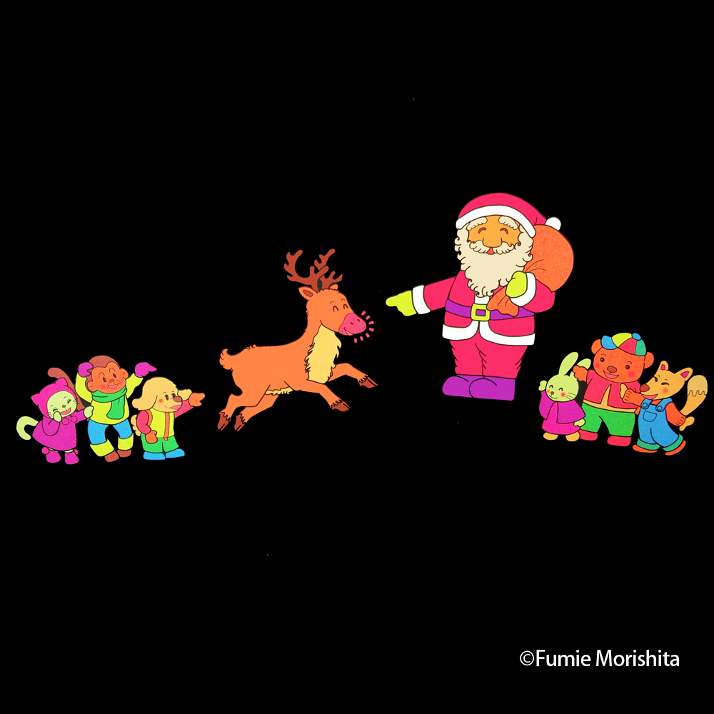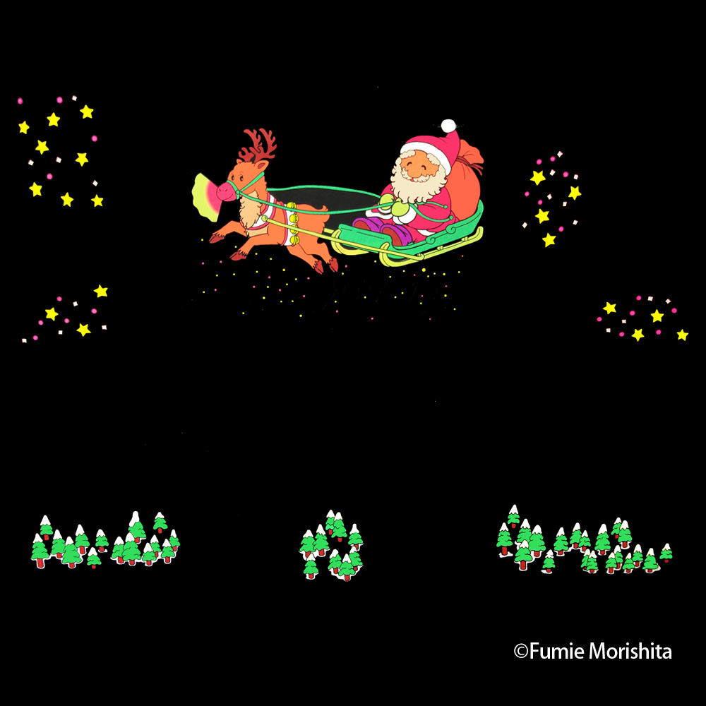 足もとに森や町が広がる星空を、トナカイが引くそりに乗ったサンタクロースが走ります。ラストシーンで「メリークリスマス!」の文字が、夜空に浮かびあがるしかけです。